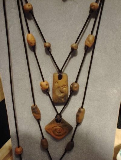 These Beautiful Pit Fired Necklaces are handmade. Each necklace has its own unique characteristics. First kiln fired, then the beads are placed in a pit and fired with wood. Copper, salt, seaweed,and sage may also be added to the fire. After the fire the beads are cleaned and a clear Acrylic is applied to preserve the finish.